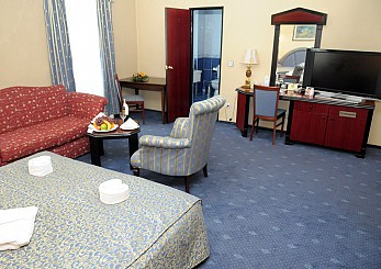 Просторный номер (30 м. кв.) с большой кроватью, мягкой мебелью и отдельным санузлом с джакузи.